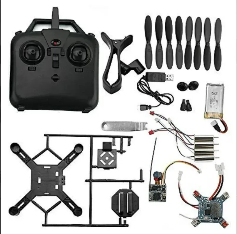 Frame, motors, flight controller, propellers, battery, and transmitter.